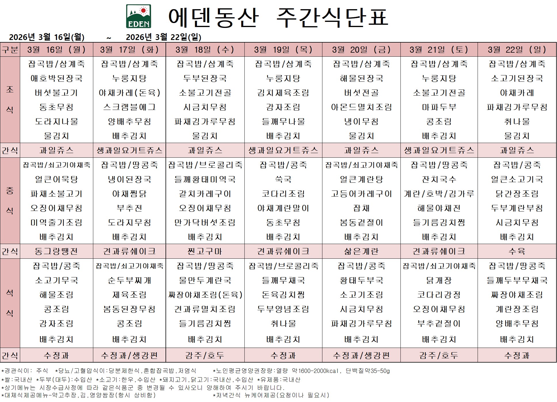 2026년 3월 16일 ~ 2026년 3월 22일 식단표
